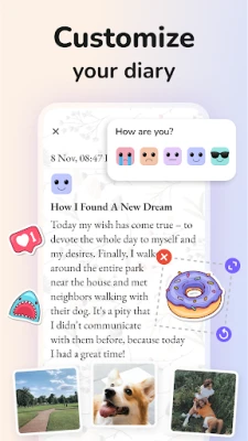 Превърнете всеки запис в живо свидетелство на времето, като добавяте снимки към текстовите си бележки. Daily Diary: Journal with Lock не е просто текстов дневник, а фотоалбум на вашите преживявания, позволяващ ви да съживявате всеки ценен момент. Календарът ще ви помогне да организирате плановете си и да отбелязвате важни дати, гарантирайки, че никога няма да забравите събитие, среща или озарение. Вграденият инструмент за проследяване на настроението пък ще ви даде ценен поглед върху емоционалния ви свят, помагайки ви да разбирате по-добре себе си и какво ви носи щастие или тъга.