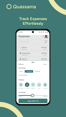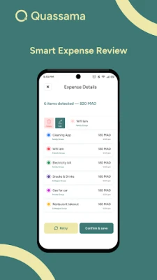 Записването на харчовете е интуитивно – бързо добавяйте суми с подробни описания и персонализирани категории. Няма нужда от калкулатори или сложни сметки; Quassama автоматично разпределя разходите между членовете, било то поравно или чрез персонализирани дялове. Приложението е вашият незаменим помощник за бързо уреждане на балансите, като всеки ясно вижда кой на кого дължи. С интелигентни известия винаги ще бъдете в течение за всяка нова транзакция, актуализация или уреждане. За да е още по-удобно, Quassama предлага поддръжка на арабски, английски и френски език, както и възможност за създаване на собствени категории.